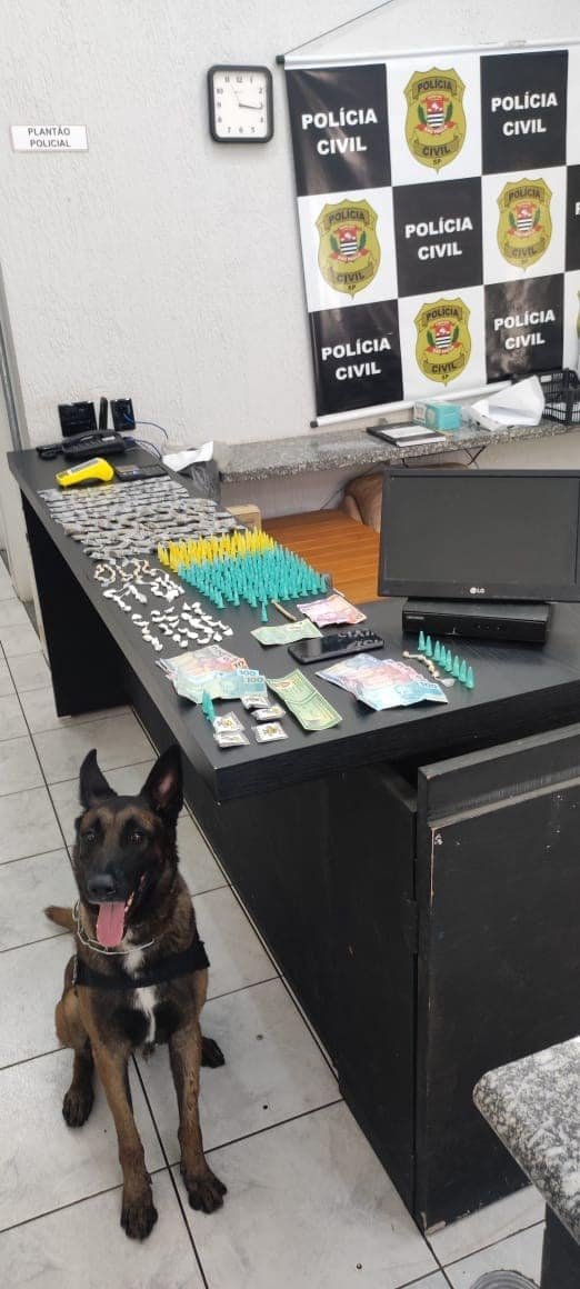 Dentro da pochete rosa havia grande quantidade de drogas já fracionados e prontos para venda, reforçando a atuação da casa como ponto ativo de tráfico de drogas. Na sequência, os policiais iniciaram varredura detalhada no imóvel com apoio do cão policial DEXTER, treinado para localizar drogas. O animal indicou locais específicos com odor de drogas, direcionando as buscas para o quarto da residência.