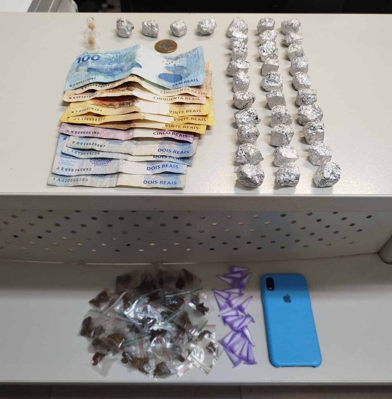 Na busca pessoal, foram localizados um aparelho celular, R$ 274 em dinheiro e duas porções de substância semelhante à maconha. Questionado, o adolescente admitiu que realizava a venda de entorpecentes desde o período da manhã e confirmou que havia acabado de atender um comprador.