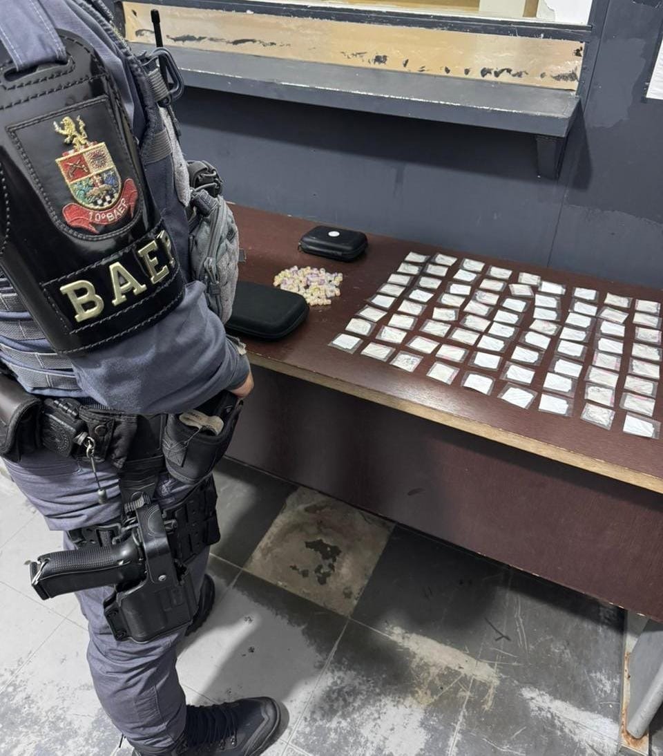 Na busca pessoal, os policiais localizaram com o condutor uma pochete contendo 80 pedras de crack e, com o passageiro, outra pochete com 72 papelotes de cocaína. Ao todo, foram apreendidos aproximadamente 0,056 kg de cocaína e 0,054 kg de crack, além de dois aparelhos celulares da marca Motorola, reforçando a suspeita de que o local era utilizado como ponto de apoio para o tráfico de drogas em Hortolândia.