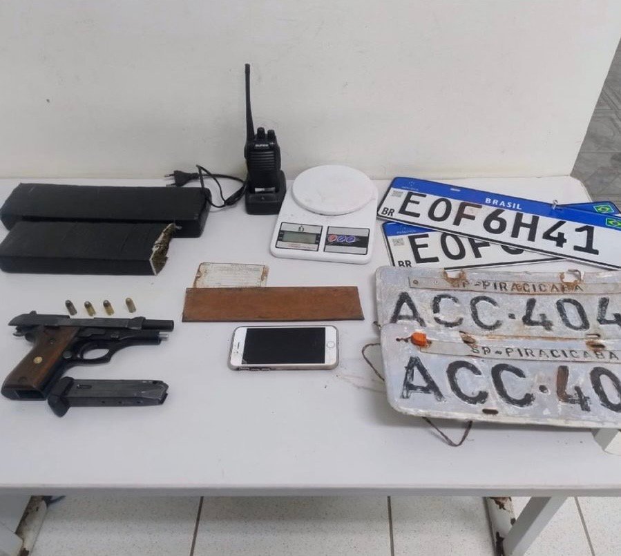 A ação do BAEP resultou ainda na apreensão de uma pistola calibre .380, quatro munições, dois tijolos de maconha, uma balança de precisão, quatro placas veiculares, parte de um chassi e um aparelho celular, que serão periciados para auxiliar nas investigações sobre outros possíveis crimes ligados ao grupo.