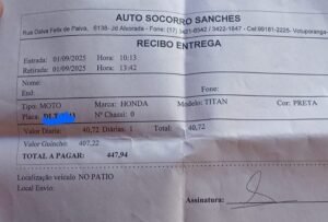 Um munícipe apresentou à nossa reportagem recibo no valor de R$ 447,00 referente à remoção de motocicleta.