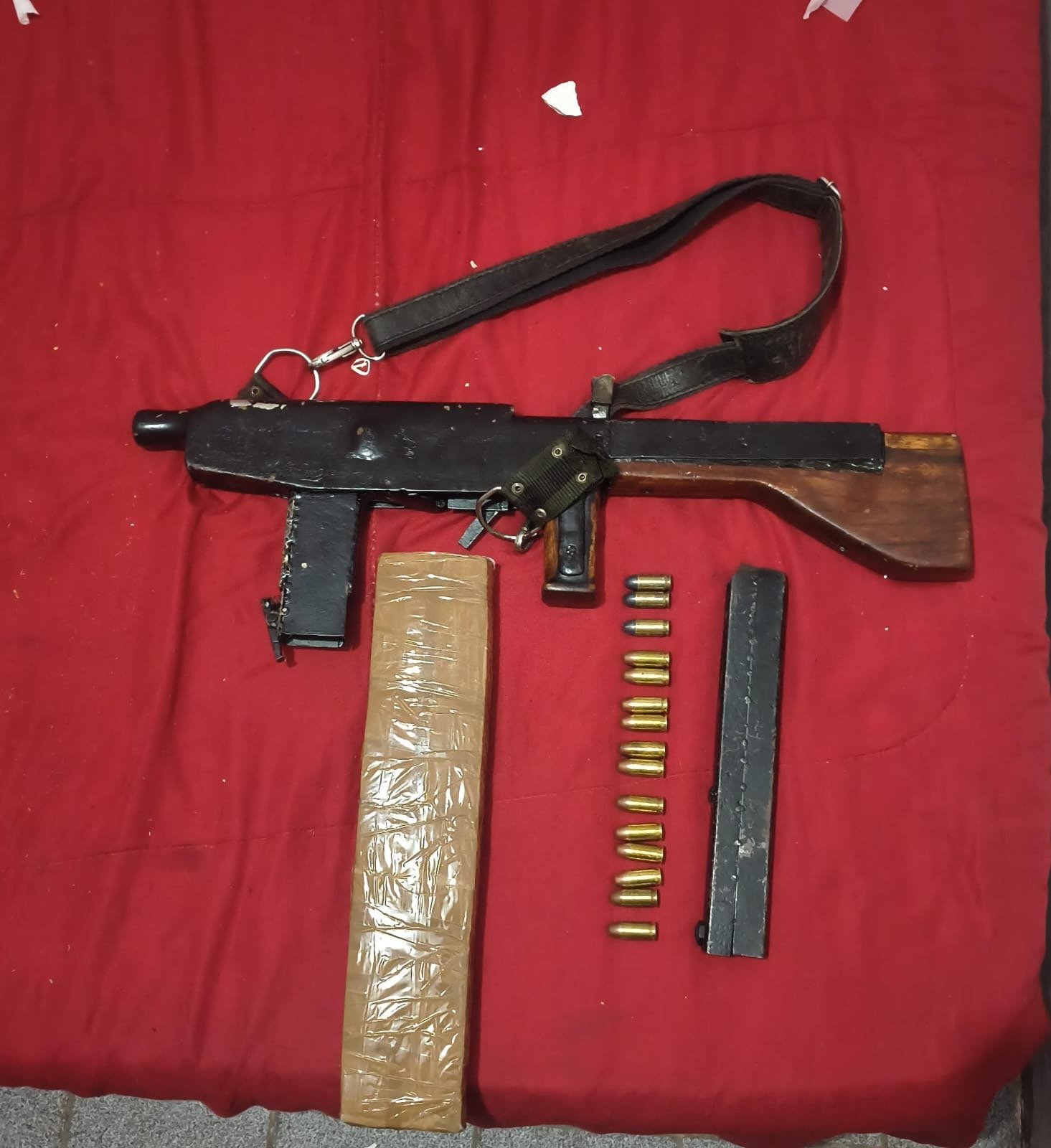 Durante buscas no imóvel, foram encontrados ainda uma metralhadora artesanal calibre 45, um carregador com 15 munições e um tablete de maconha escondido embaixo de um colchão.
