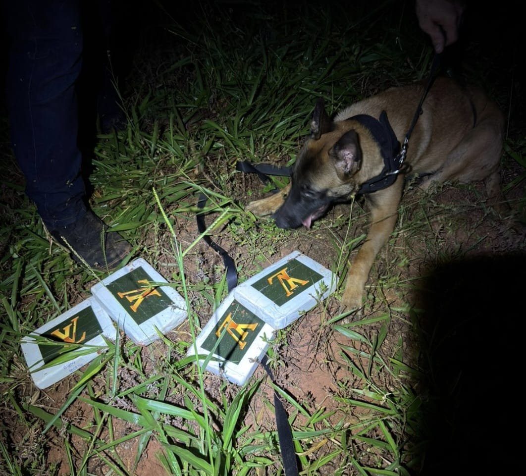 Com apoio de um cão farejador, k9 Dux, a DISE localizou, em um terreno nos fundos da residência, um tambor enterrado com quatro tijolos de cocaína, totalizando mais de quatro quilos da droga.