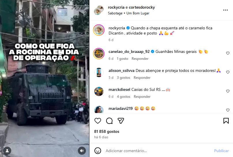 A Rocinha carrega uma rotina intensa, marcada por contrastes, desafios sociais e pela presença constante do crime organizado e das forças de segurança. Ver essa realidade de perto é enxergar o lado humano por trás das estatísticas, onde milhares de famílias vivem, trabalham e lutam diariamente por dignidade e paz. Crédito: @Rockycria/Instagram