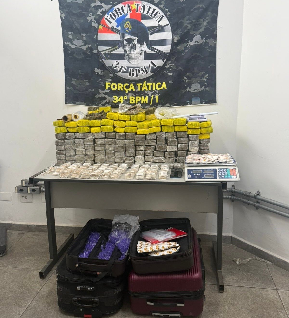 Durante a busca domiciliar, os policiais encontraram diversas malas de viagem e caixas de papelão contendo 83,844 quilos de maconha, 1.064 papelotes de cocaína, 187 pedras de cocaína e 55 pedras de crack, além de balanças de precisão, celulares, facas, rolos de embalagens plásticas, adesivos e um caderno de anotações com informações sobre o tráfico.