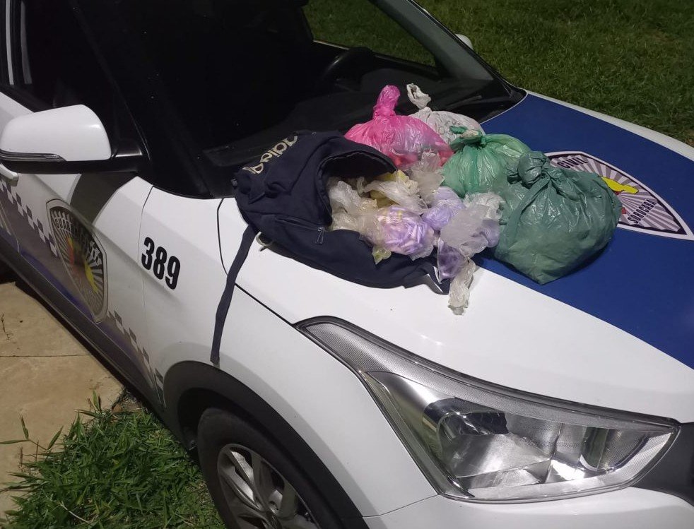 Na verificação da mochila abandonada, a equipe encontrou sacolas identificadas como “Loja 1”, “Loja 2”, “Loja 3” e “Loja 4”, contendo grande quantidade de porções de drogas. Ao todo, foram apreendidas 1.985 porções de cocaína, 572 de maconha, 534 de crack e 85 de ice.
