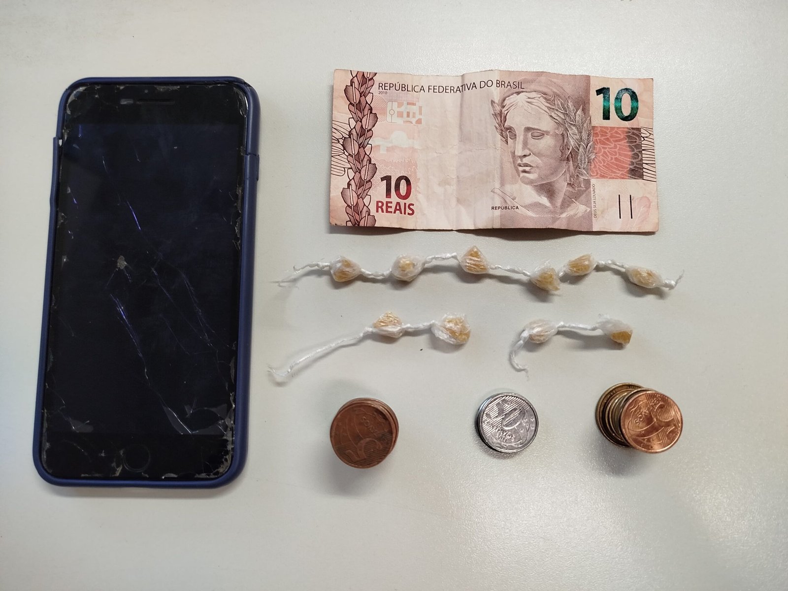 Os guardas recuperaram os objetos descartados, que foram identificados como 10 pedras de crack. Durante busca pessoal, também localizaram R$ 13,15 em dinheiro. Questionado, o criminoso admitiu inicialmente que atuava no tráfico de drogas, mas depois se calou diante dos agentes.