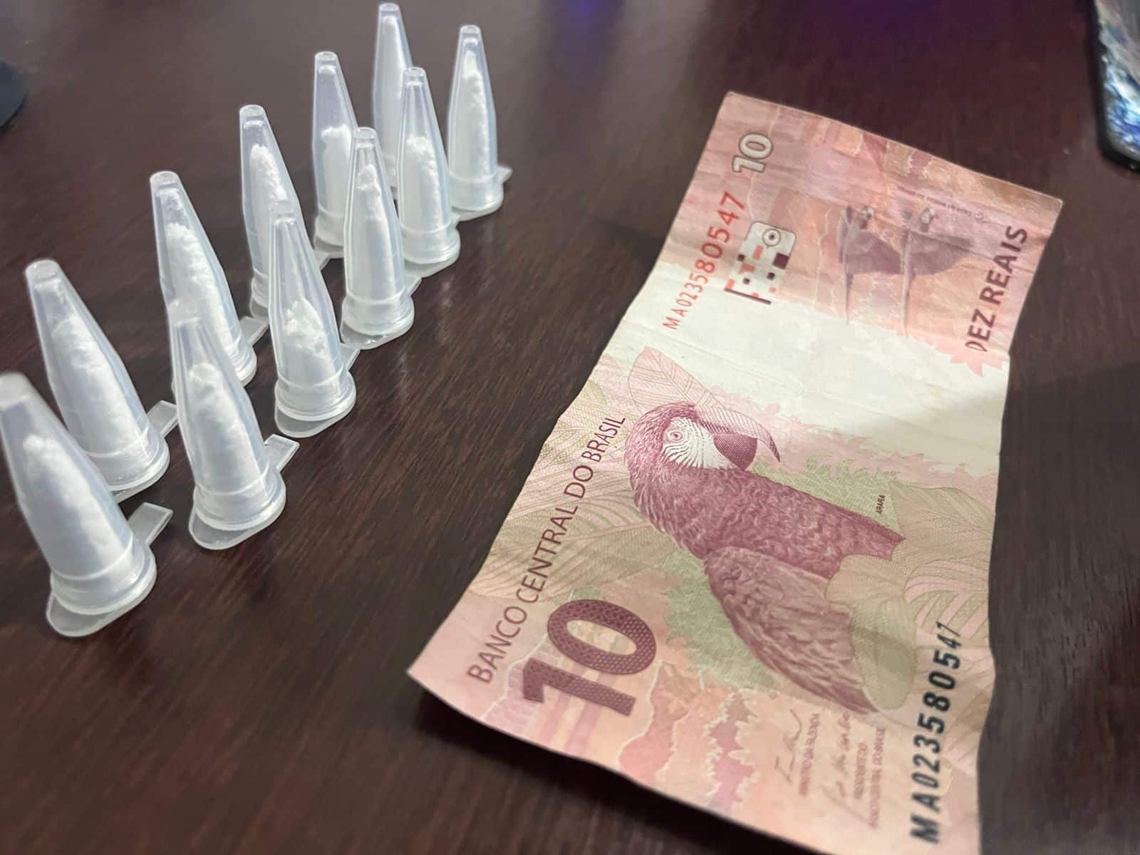 homem preso com cocaína na operação Impacto em Cosmópolis #PraCegoVer: imagem mostra pinos de cocaína em fileira dupla contendo 11 pinos e uma nota de R$10 encima de uma mesa na delegacia