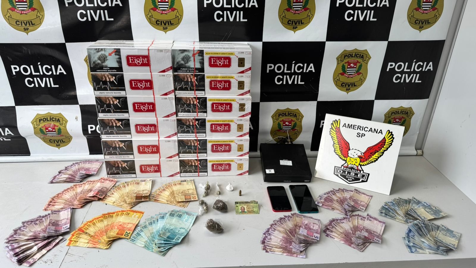 Durante as buscas no local, os policiais apreenderam porções de maconha e cocaína, grande quantidade de cigarros de origem paraguaia, caracterizando contrabando, além de munição intacta, aparelhos celulares e mais de R$ 4 mil em dinheiro, valor que, segundo as investigações, estaria relacionado à atividade criminosa.