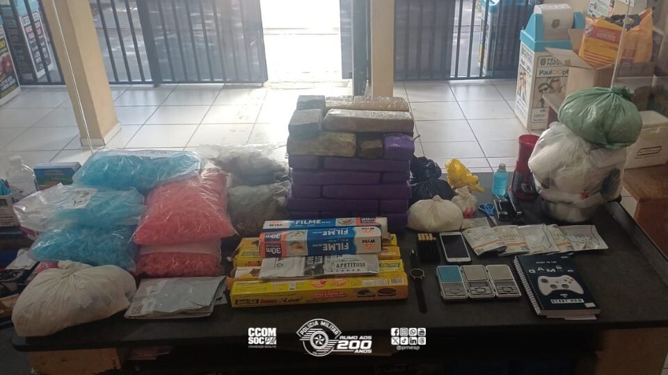 Questionado, o criminoso afirmou que havia mais drogas dentro da residência e autorizou a entrada da equipe. Na busca pelo imóvel, os policiais localizaram 21,309 kg de maconha, 1,459 kg de cocaína, 21 g de crack, 80 g de fumo blend, além de 5.500 microtubos vazios, três balanças digitais, munições, embalagens diversas, um caderno de anotações, um relógio e um aparelho celular.