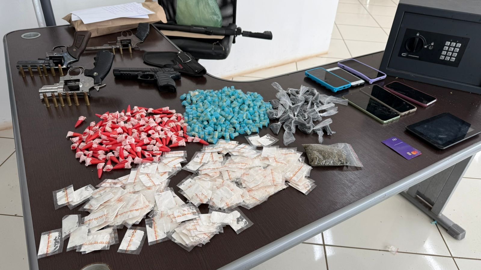 Durante as ações, foram apreendidas duas armas de fogo, dois simulacros, 15 munições, cerca de 4,1 quilos de drogas variadas, R$ 4.825,50 em dinheiro, uma motocicleta, um veículo Gol e diversos equipamentos utilizados para a prática de roubos.