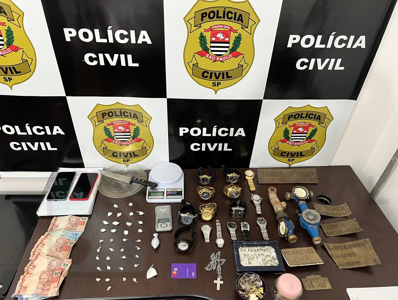 Durante as buscas no imóvel, os policiais localizaram diversas porções de crack e cocaína, além de utensílios usados no preparo das drogas, como prato e faca com resquícios de manipulação recente. Também foram apreendidas balanças de precisão, caderno com anotações relacionadas ao tráfico e diversas cédulas de dinheiro trocado.