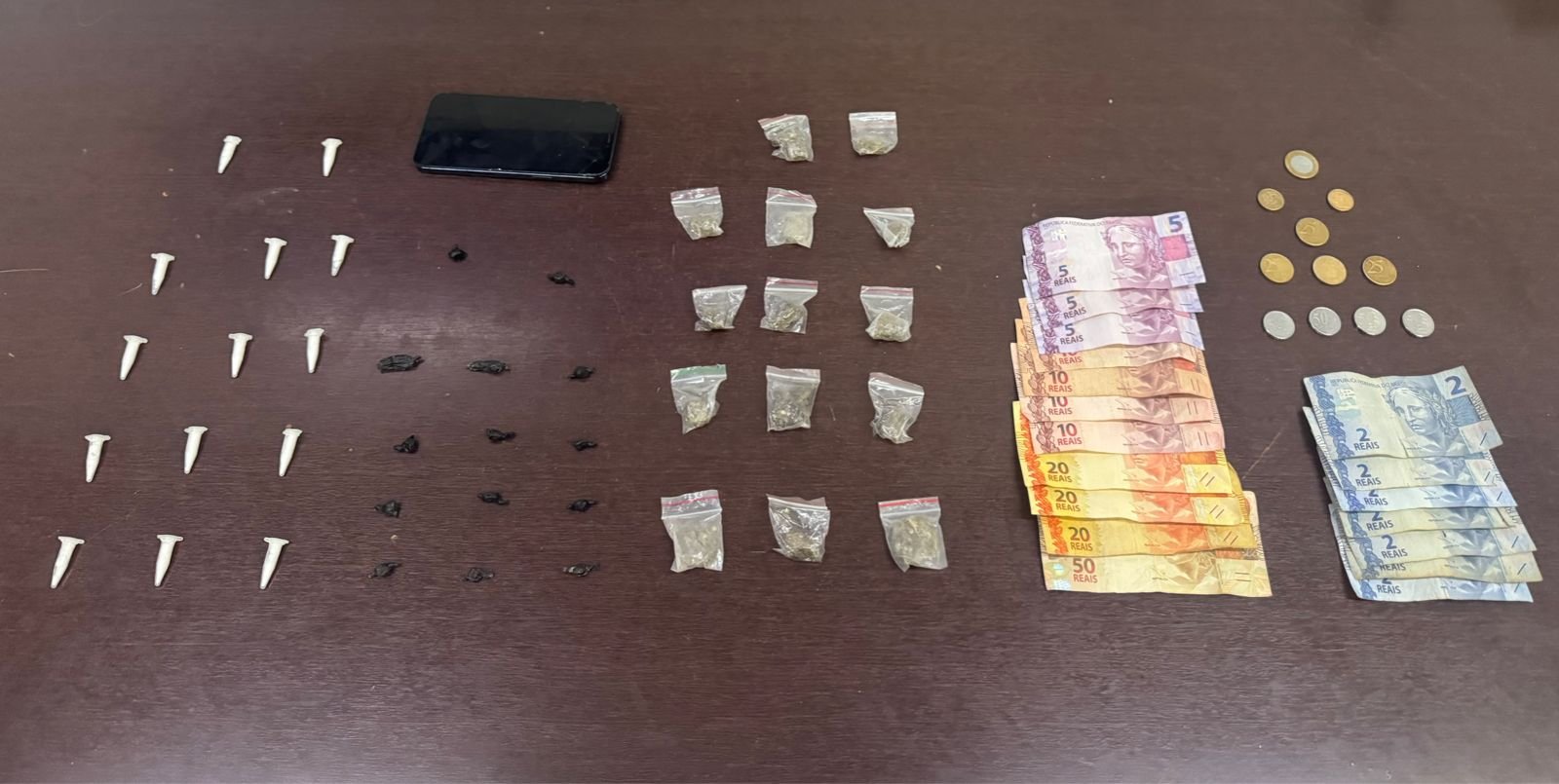 Durante a ação, o homem resistiu e tentou fugir, sendo necessário o uso de força moderada para a contenção e o algemamento, conforme o boletim. No decorrer da revista, os policiais localizaram 14 porções de maconha, 14 porções de crack, 14 porções de cocaína, R$ 183,20 em dinheiro e um celular da marca Apple.