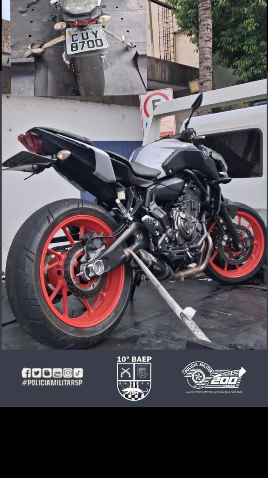 Na vistoria detalhada da motocicleta, os policiais perceberam que a placa havia sido alterada com o uso de fita isolante, transformando o número original CUY 0700 em CUY 8700, o que explicava a divergência apontada na consulta. Com isso, foi confirmada a adulteração de sinais identificadores de veículo automotor, além de ficar comprovado que se tratava realmente da Yamaha MT-07 prata registrada com o emplacamento CUY 0700.