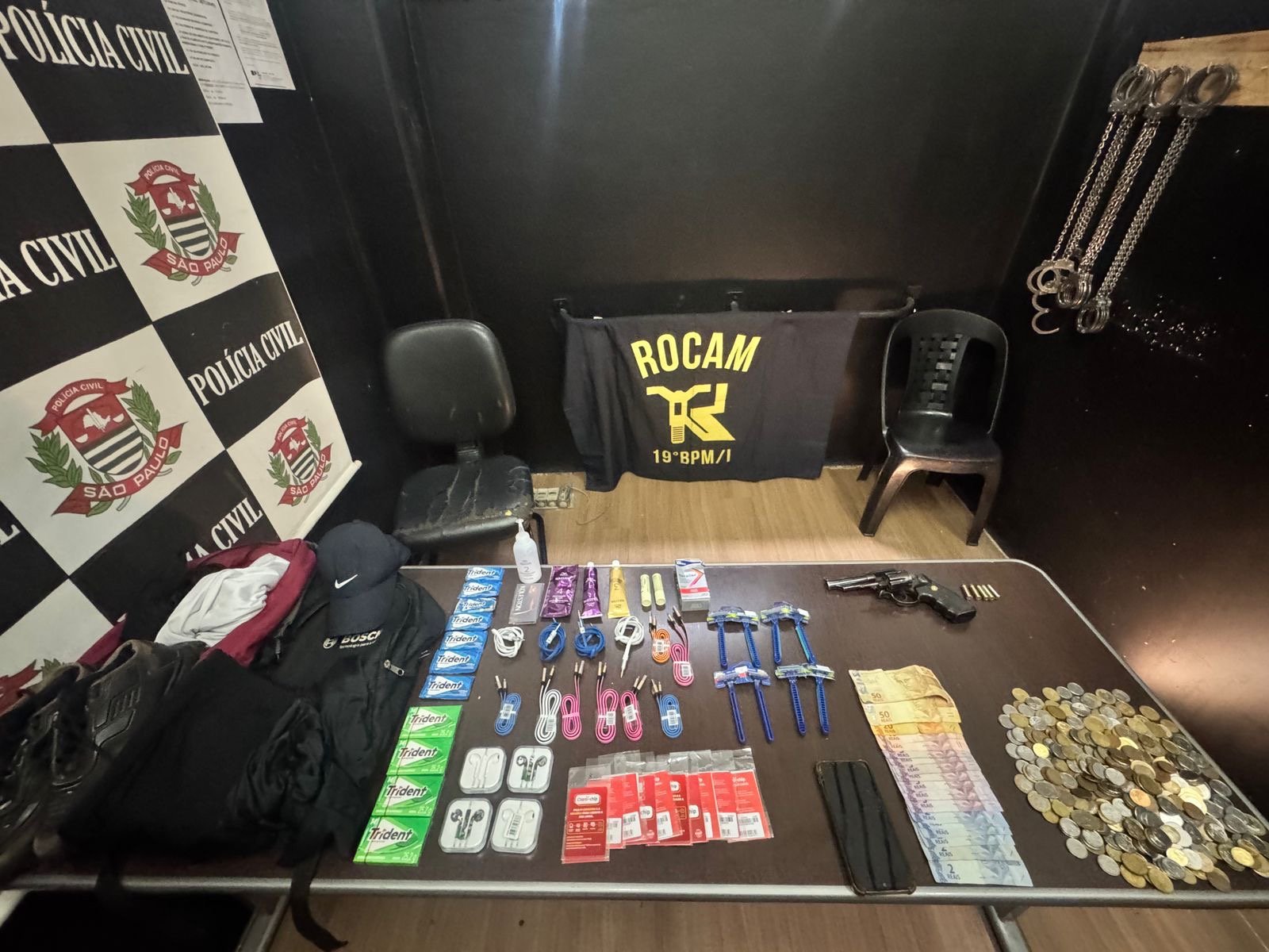 Entre os materiais recuperados estavam R$ 324,20 em notas e moedas, celulares, carregadores, fones de ouvido, mochilas, roupas, produtos de higiene e medicamentos. Os dois homens foram reconhecidos pela vítima e levados à delegacia, onde permaneceram presos à disposição da Justiça.