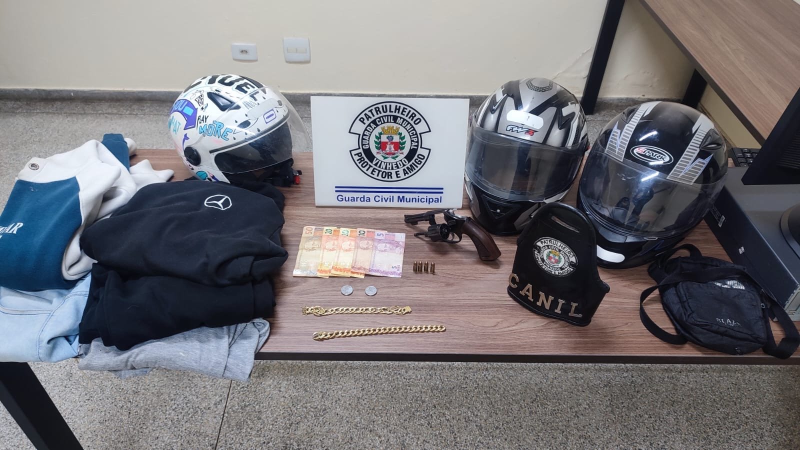 Durante a abordagem, um dos criminosos arremessou uma bolsa preta em meio ao matagal, onde foi encontrada a arma utilizada no assalto, além de dois cordões de ouro, roupas usadas na ação, R$ 106 em dinheiro, três celulares e a motocicleta adulterada.