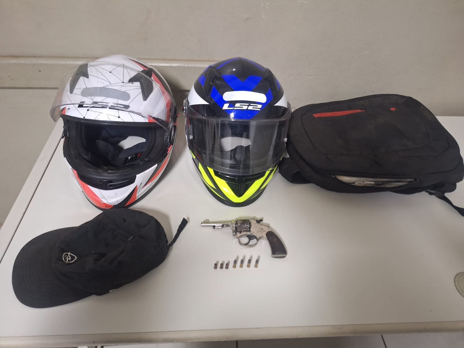Em diligências pela região, a equipe da ROMU localizou dois homens pela Estrada do Pau Queimado, portando dois capacetes. Durante busca pessoal, foi encontrada com um deles a chave da motocicleta e, com o outro, identificado pelo apelido de “Cowboy”, uma arma de fogo calibre .22 contendo quatro munições intactas.